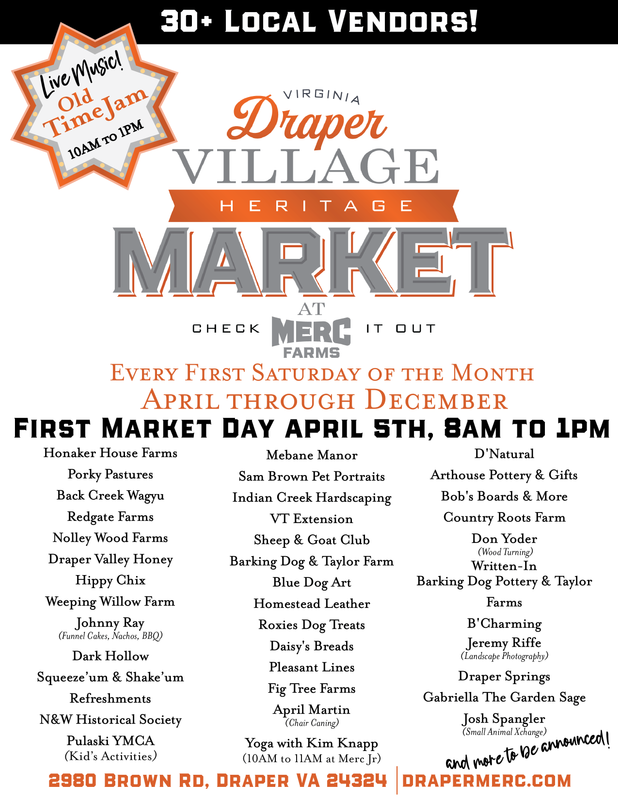 We’re excited to kick off our very first Draper Heritage Market! Our market will be held on the first Saturday of every month with a new theme each month. Located in the heart of Draper, VA, the Draper Village Heritage Market is a vibrant gathering place that celebrates our community’s rich heritage, craftsmanship, and agricultural roots.