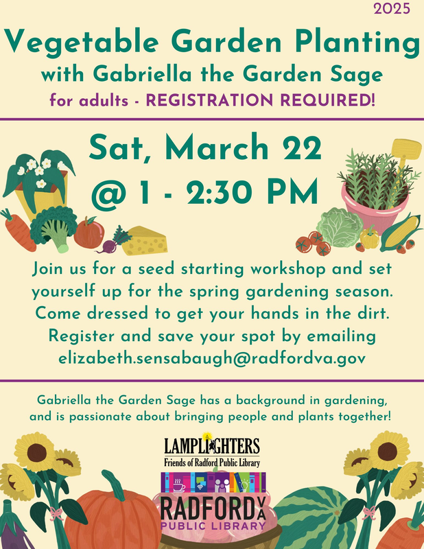 The Radford Public Library presents Vegetable Garden Planning for Adults with Gabriella the Garden Sage on Saturday, March 22, 2025.