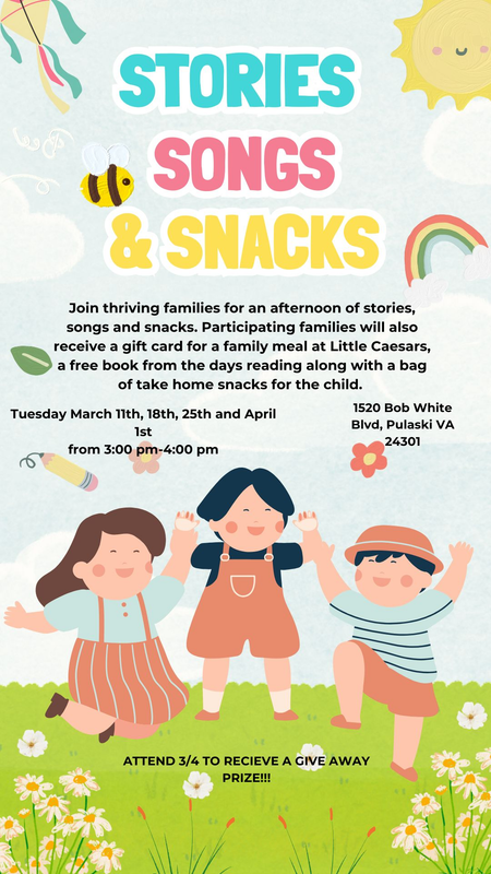 Thriving Families Pulaski presents Stories, Songs & Snacks on Tuesday, April 1, 2025.