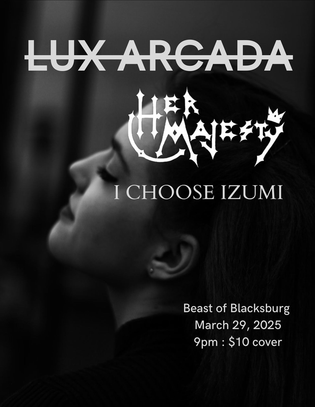 The Beast of Blacksburg Pizzeria & Bar presents Three Band Concert with Lux Arcada, Her Majesty and I Choose Izumi on Saturday, March 29, 2025.