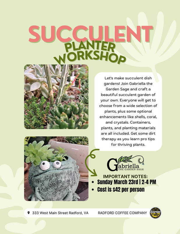 Radford Coffee Company presents a Succulent Planter Workshop on Sunday, March 23, 2025.