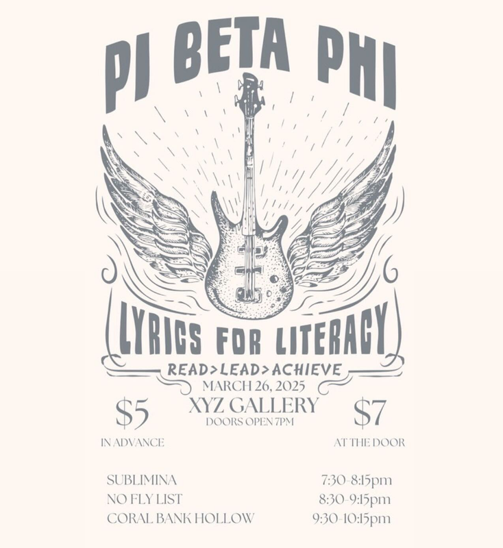 Pi Beta Phi presents their Lyrics For Literacy Three Band Concert on Wednesday, March 26, 2025 at the XYZ Art Gallery in downtown Blacksburg, VA.