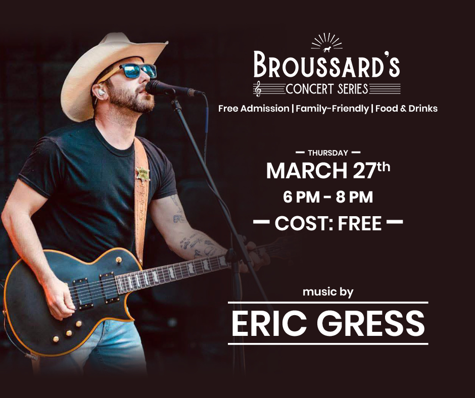 Broussard’s is kicking off a brand-new family friendly Concert Series happening once a month! Join us for our very first event featuring live music from Eric Gress!