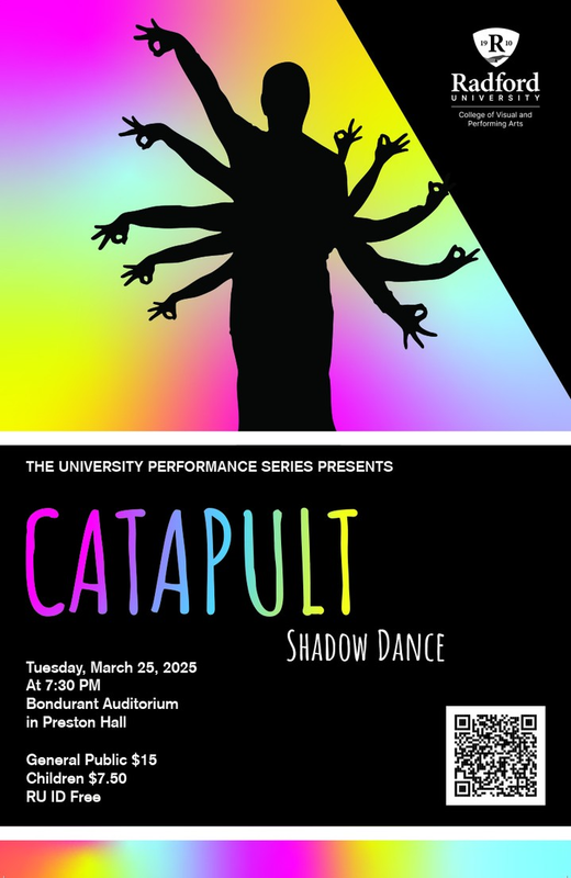 The Radford University College of Visual & Performing Arts continues their 2024/2025 University Performance Series with the performance "Catapult (Shadow Dance)" on Tuesday, March 25, 2025 inside the Bondurant Auditorium located within Preston Hall on the campus of Radford University.