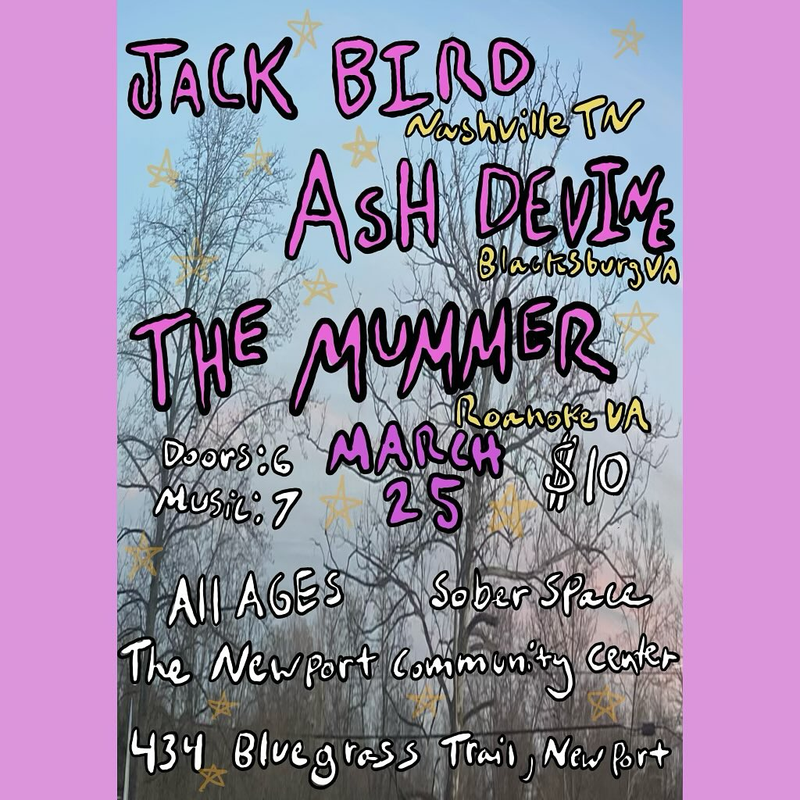 Enjoy an evening of experimental folk and noise! Jack Bird is a musician from Nashville, Tennessee, Ash Devine is from Blacksburg, VA and The Mummer is from Roanoke, VA.