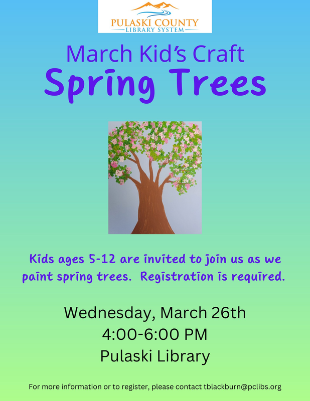 The Pulaski County Library presents March Kid's Craft Spring Trees on Wednesday, March 26, 2025.