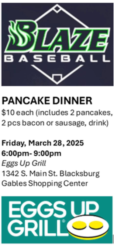 Eggs Up Grill - Blacksburg presents a Pancake Dinner Fundraiser for Blaze Baseball on Friday, March 28, 2025.