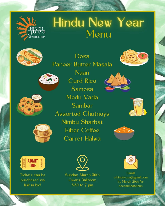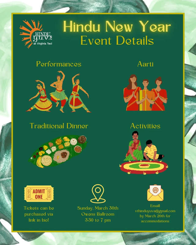 Hindu YUVA at Virginia Tech presents their Hindu New Year Celebration on Sunday, March 30, 2025 at the Owens Hall Ballroom on the campus of Virginia Tech.