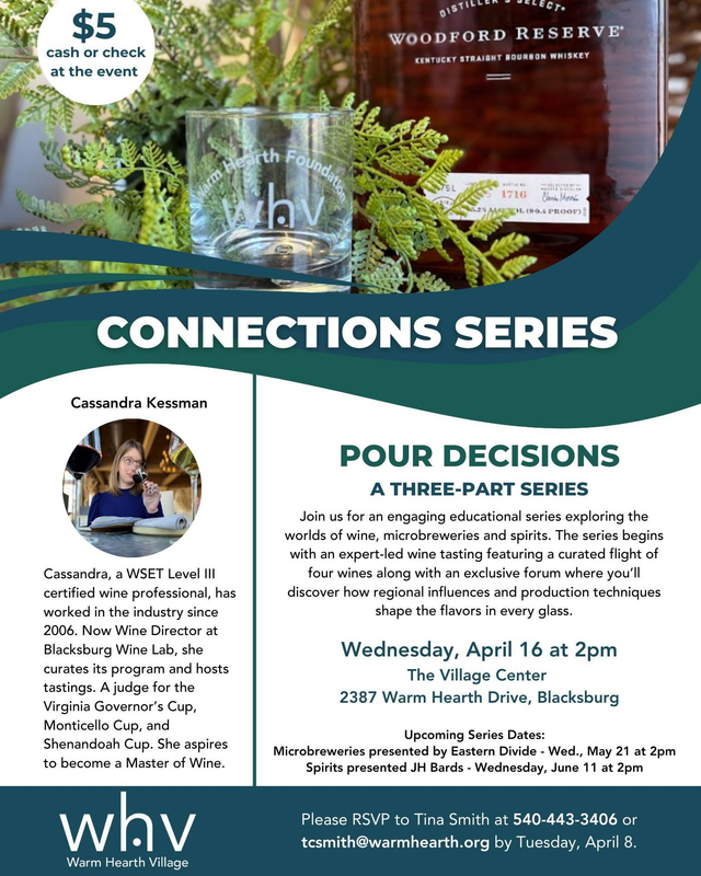 Warm Hearth Village Center presents the first event in their new Connections Series titled "Pour Decisions" on Wednesday, April 16, 2025.
