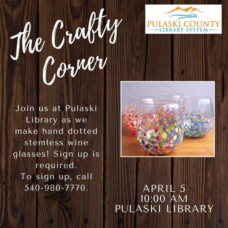 The Pulaski County Library continues their monthly The Crafty Corner series in April with the theme "Dotted Wine Glasses" on Saturday, April 5, 2025.