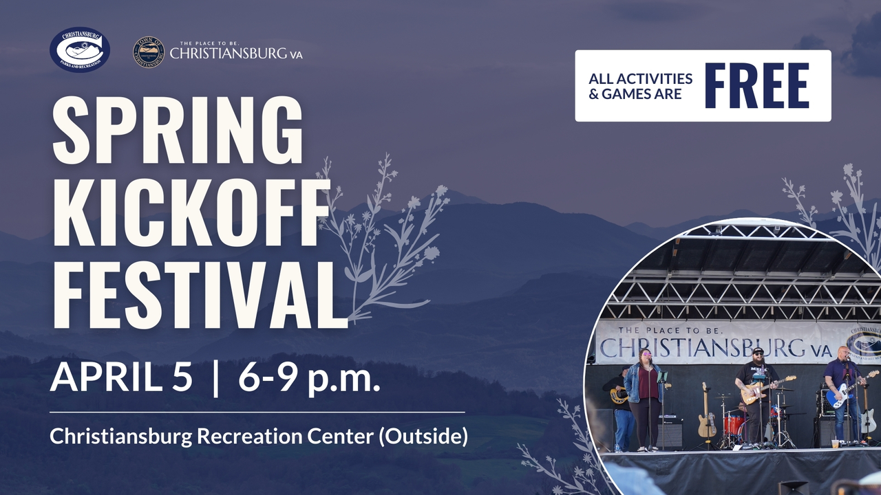 The Town of Christiansburg and Christiansburg Parks & Rec present the 2025 Spring Kickoff Festival on Saturday, April 5, 2025 at the Christiansburg Recreation Center.
