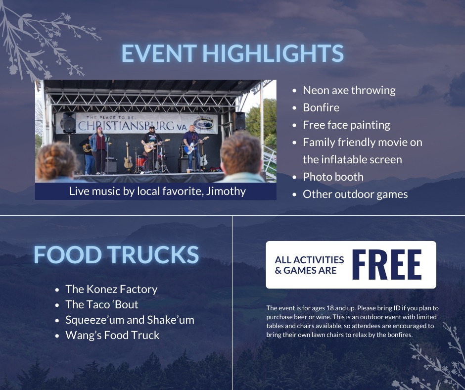 Enjoy live music by Jimothy, bonfire, outdoor activities, photo booth, free face painting, neon axe throwing, games and movie on an inflatable screen.