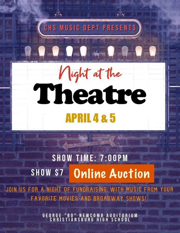 The Christiansburg High School Music Department presents "Night at the Theatre" on Friday, April 4, 2025 and Saturday, April 5, 2025 inside the George "Bo" Newcomb Auditorium at Christiansburg High School.
