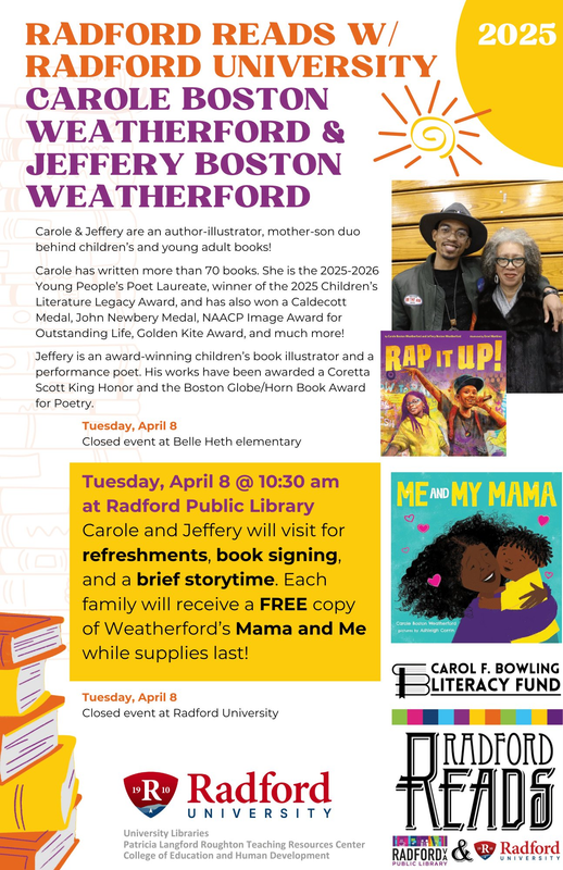 The Radford Public Library presents Radford Reads with Radford University hosting Author & Illustrator Carole Boston Weatherford and Jeffery Boston Weatherford on Tuesday, April 8, 2025.
