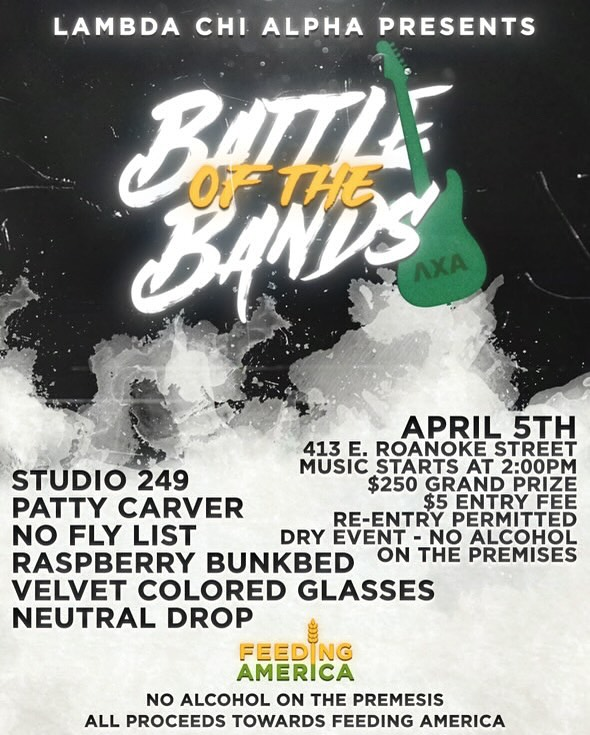 Lambda Chi Alpha at Virginia Tech presents their 1st Annual Battle of the Bands for Feeding America on Saturday, April 5, 2025.