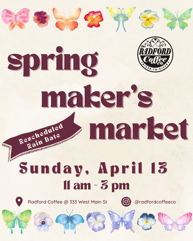 Join us for our Spring Maker's Market! We will have over 20 different vendors with a variety of specialties. Radford Coffee Company will be open with all menu items available.