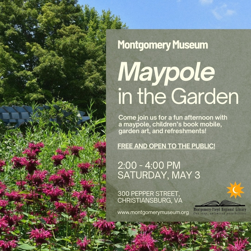 This fun event will feature the "Bugs. Pollinators, and Plants" themed garden art created by the community, a children's maypole activity, and a special children's story time from the Montgomery-Floyd Mobile Library. Come see and learn about native plants and pollinators, while enjoying some cookies and lemonade as well!