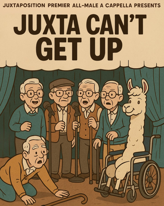 Juxtaposition is Virginia Tech's Premier All-Male A-Cappella Group since 1994. Join us for an exciting 2.5-hour concert for a stunning vocal performance showcasing our award-winning songs in the International Competition of Collegiate A-Cappella (ICCA). Beloved by students at Virginia Tech, this concert is an event to see. Themed comedically as a retirement home, our concert named "Juxta Can't Get Up" is sure to leave you laughing as well.