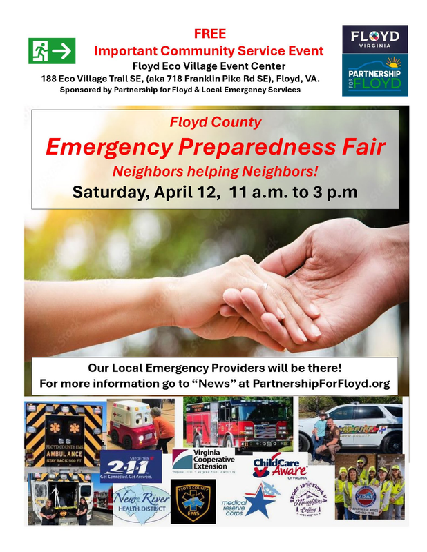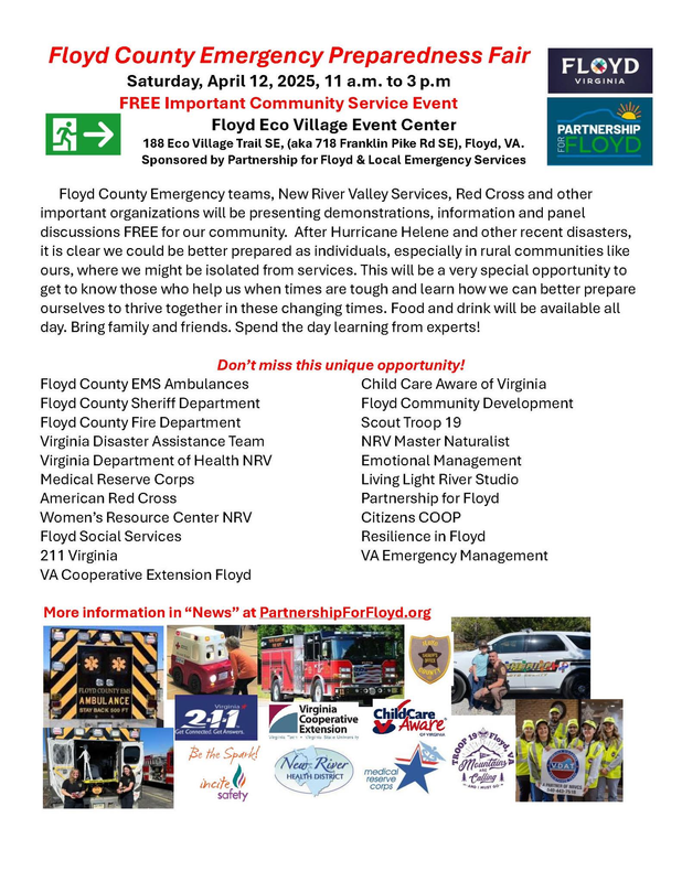 The Partnership for Floyd and Local Emergency Services presents the 1st Emergency Preparedness Fair on Saturday, April 12, 2025 at Floyd EcoVillage.