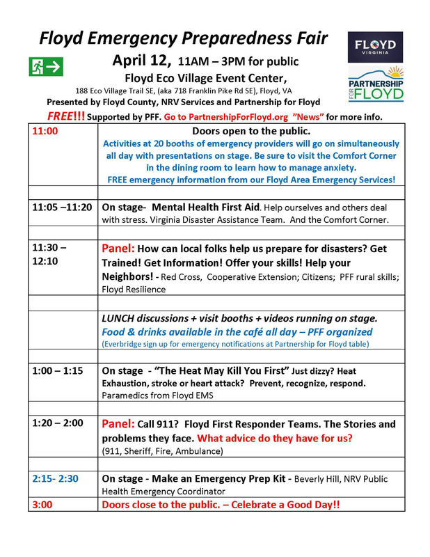 Floyd County Emergency teams, New River Valley Services, Red Cross and other important local organizations will be presenting demonstrations, information and panel discussions on state and at 20 booths free for our community.