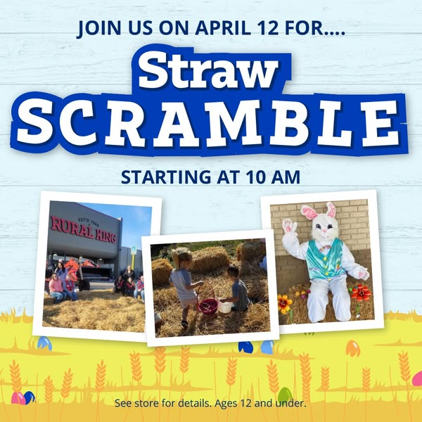 Rural King presents their Annual Straw Scramble for Ages 12 & Under on Saturday, April 12, 2025.