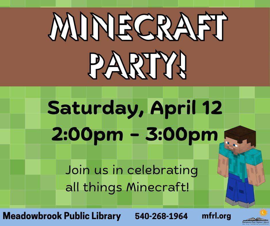 The Meadowbrook Public Library presents a Minecraft Party on Saturday, April 12, 2025.
