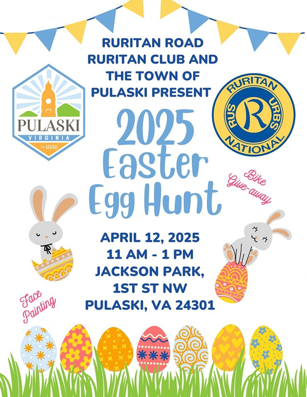 The Town of Pulaski and Ruritan Road Ruritan Club presents the 2025 Town of Pulaski Easter Egg Hunt on Saturday, April 12, 2025 at Jackson Park.