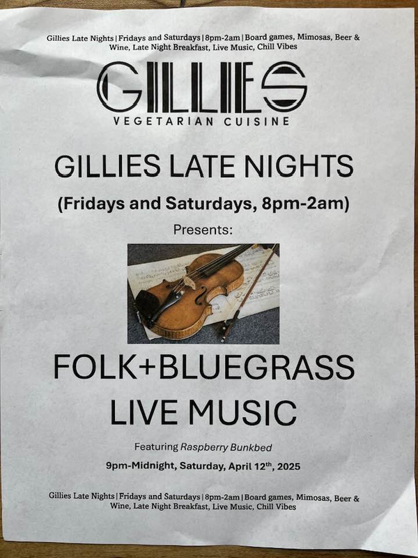 Gillie's presents Gillie's Late Nights with Raspberry Bunkbed in concert on Saturday, April 12, 2025.