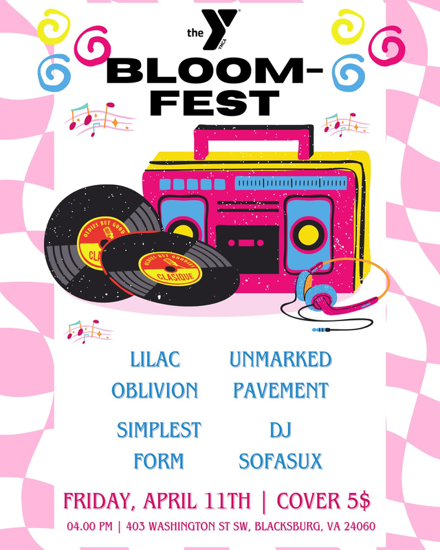 The YMCA at Virginia Tech presents Bloom Fest 2025 featuring four local bands and DJs performing on Friday, April 11, 2025 at the Y Center.