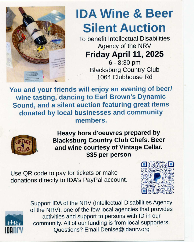 The Intellectual Disabilities Agency of the New River Valley presents their 2025 IDA Wine & Beer Silent Auction on Friday, April 11, 2025 at the Blacksburg Country Club.
