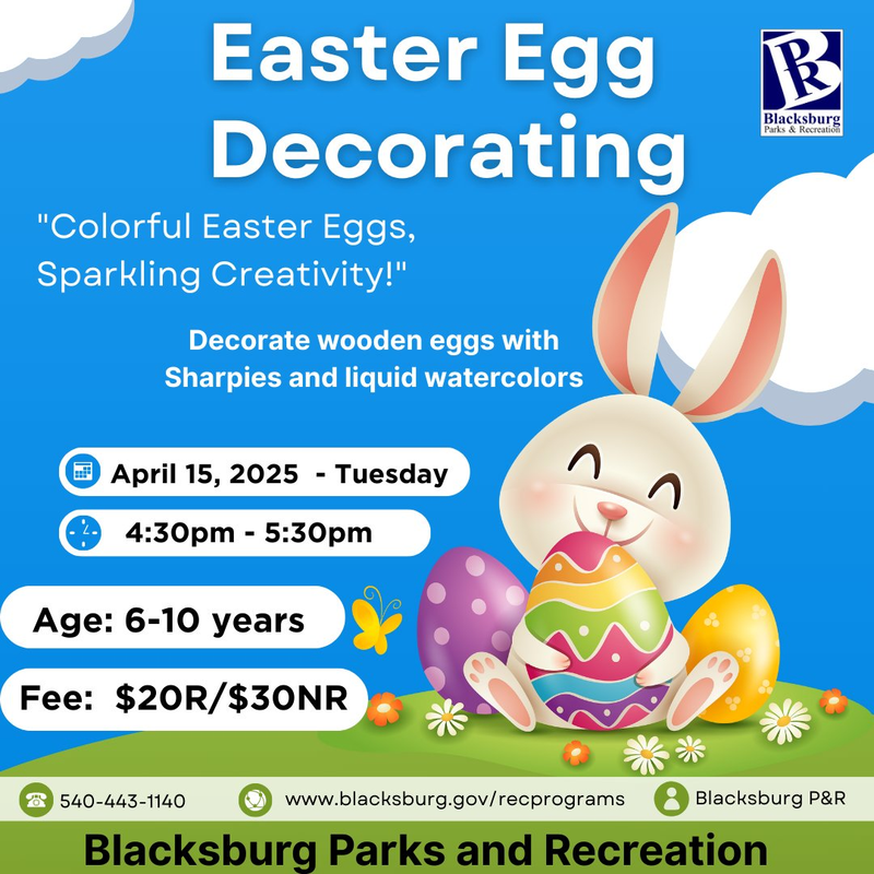 Blacksburg Parks and Recreation Department offers Easter Egg Decorating on Tuesday, April 15, 2025 at the Blacksburg Community Center.