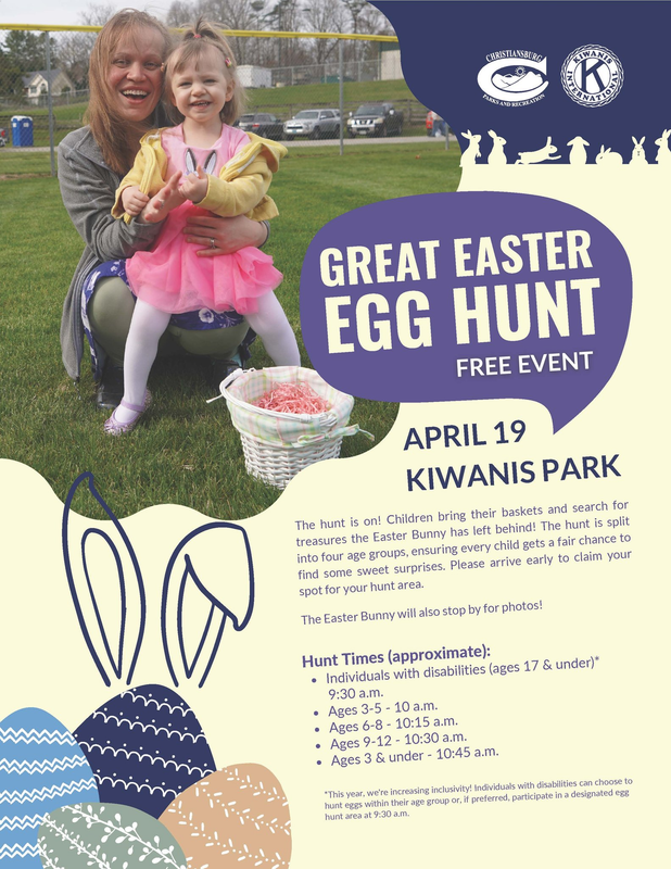 Christiansburg Parks & Recreation and The Kiwanis Club of Christiansburg present the 2025 Great Christiansburg Easter Egg Hunt for children ages 12 and under on Saturday, April 19, 2025 at Kiwanis Park in Christiansburg, VA.