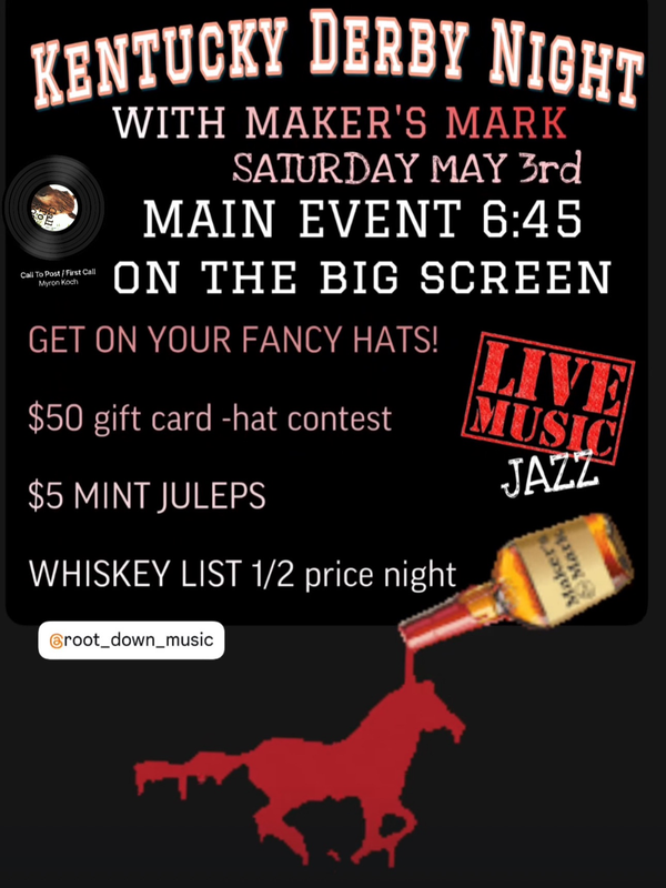 Twisted Liquid does the Kentucky Derby right! Guests can enjoy $5.00 mint juleps and half priced whiskey during the event. Wear your fanciest hat with the best one receiving a $50 gift card! Live jazz music will be performed by Root Down. The main race will be aired on the big screen at 6:45 PM.