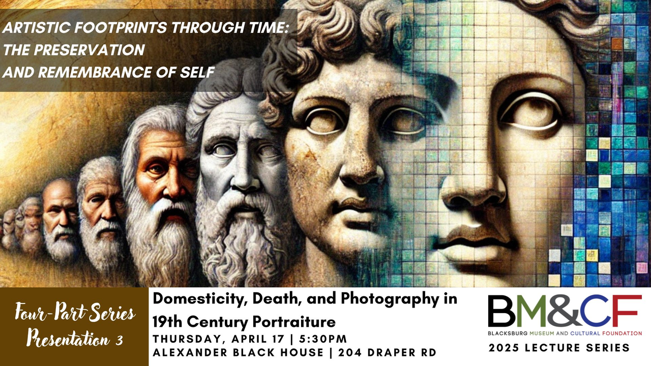The Blacksburg Museum & Cultural Foundation continues the B. Scott Crawford Lecture Series with the third event titled "You Cannot Paint her too Beautiful for my Imagination”: Domesticity, Death, and Photography in 19th Century Portraiture" on Thursday, April 17, 2025 at the Alexander Black House & Cultural Center.