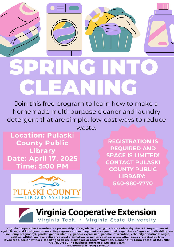 The Virginia Cooperative Extension Office will provide a program providing the audience with tips to reduce waste at home and a how to guide on making homemade organic cleaning products. We will also learn how to make some household cleaners and detergents and participants will get to take some home.