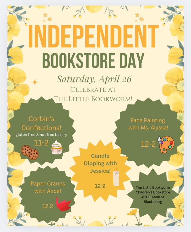 Celebrate independent bookstore day at The Little Bookworm! Stop by between 11:00 AM and 2:00 PM for candle dipping, face painting, and origami!