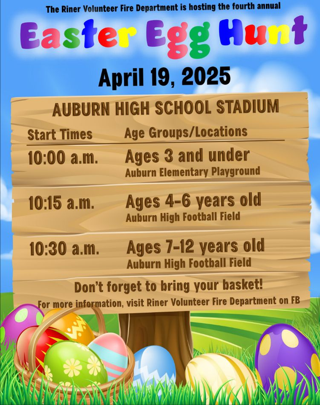 The Riner Volunteer Fire Department presents their 4th Annual Easter Egg Hunt on Saturday, April 19, 2025 at the Auburn High School Stadium.