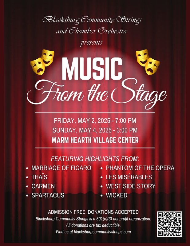 Blacksburg Community Strings and Chamber Orchestra presents their Spring Concert titled "Music from the Stage" with two performances on Friday, May 2, 2025 at 7:00 PM and on Sunday, May 4, 2025 at 3:00 PM inside the Warm Hearth Village Center.