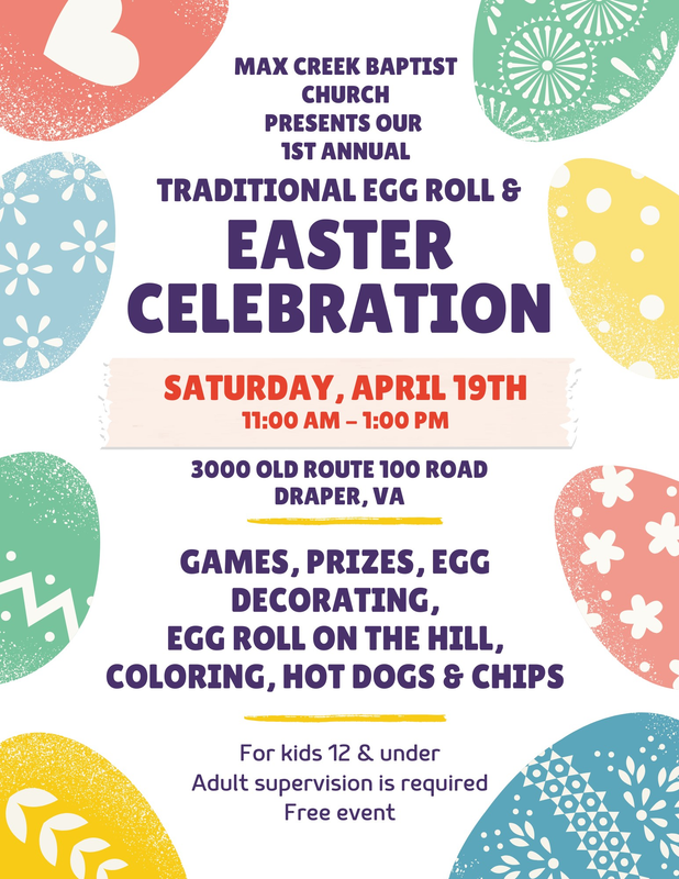 Max Creek Baptist Church presents their 1st Annual Traditional Egg Roll & Easter Celebration for Ages 12 & Under on Saturday, April 19, 2025.