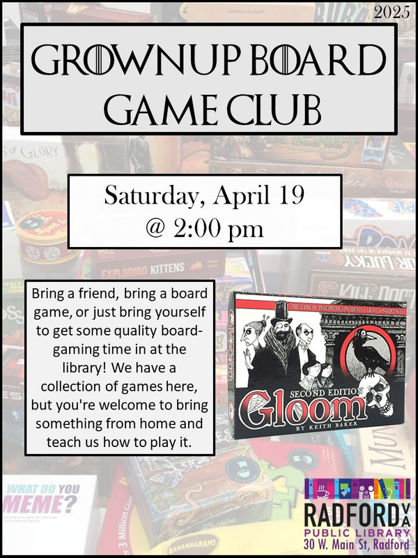 Radford Public Library presents the April Monthly Grownup Board Game Club on Saturday, April 19, 2025.