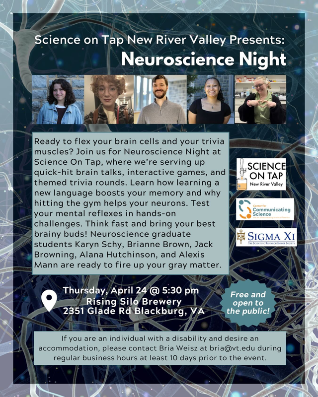 Science on Tap, New River Valley presents their April program titled "Neuroscience Night" on Thursday, April 24, 2025 at Rising Silo Farm Brewery in Blacksburg, VA.