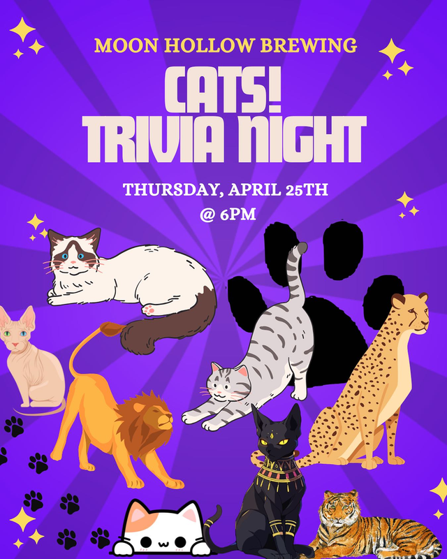 Moon Hollow Brewing presents Cats Trivia Night on Thursday, April 24, 2025.
