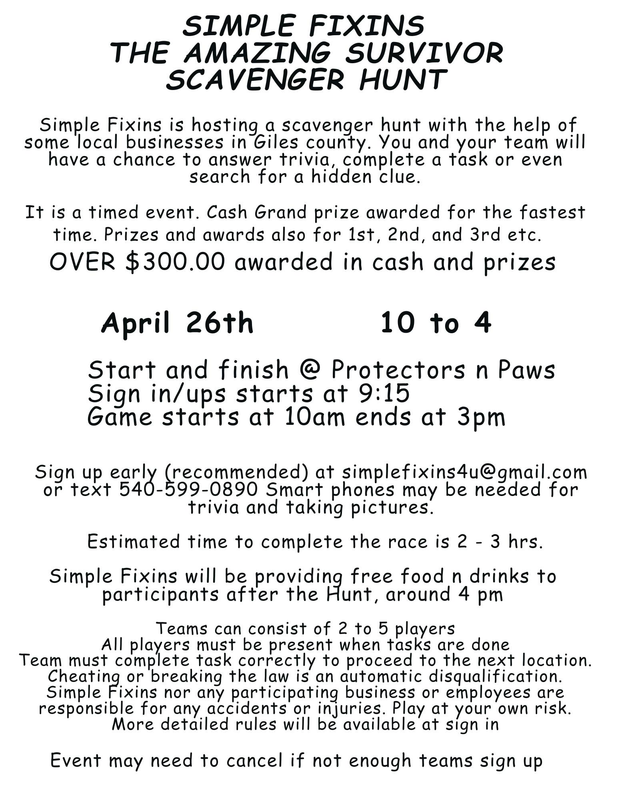 Simple Fixins hosts The Amazing Survivor Scavenger Hunt on Saturday, April 26, 2025 starting and ending at Protectors N Paws Inc.