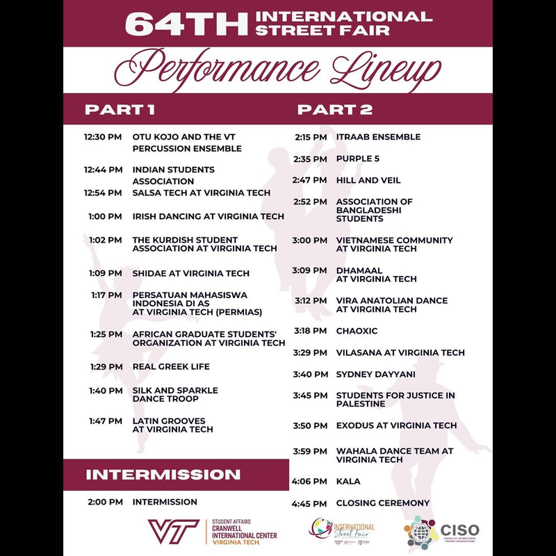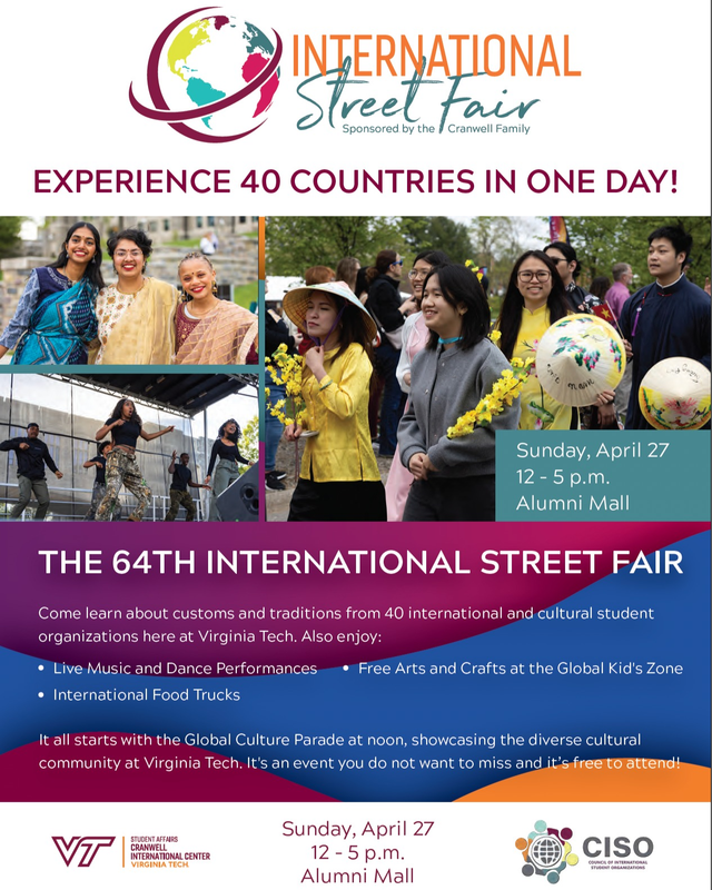 The Council of International Student Organizations (CISO) and Cranwell International Center proudly presents the 64th International Street Fair on Sunday, April 27, 2025 outside at Virginia Tech's Alumni Mall.