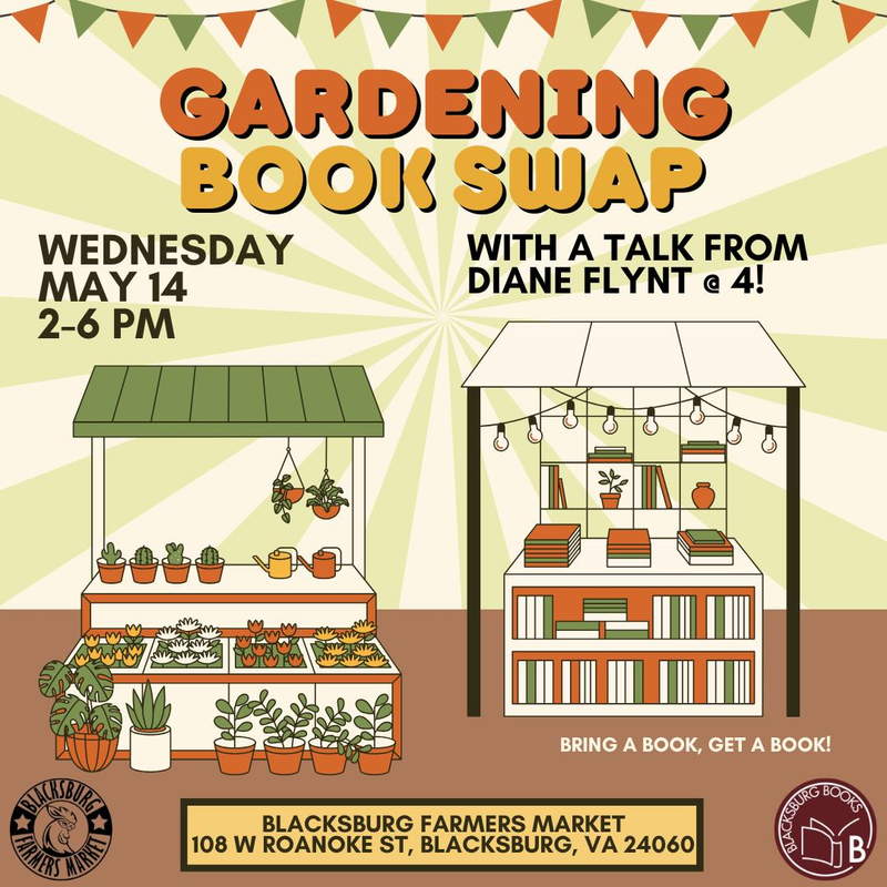 The Blacksburg Farmers Market presents a Gardening Book Swap with Blacksburg Books and Special Guest Diane Flynt on Wednesday, May 14, 2025.
