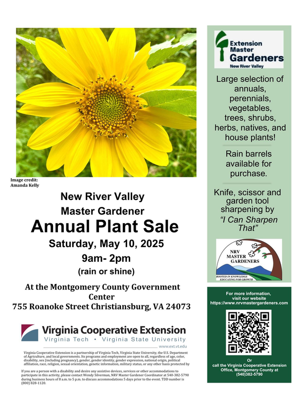 The New River Valley Master Gardener Association (NRVMGA) presents their Annual Plant Sale on Saturday, May 10, 2025 at the Montgomery County Government Center in Christiansburg, VA.