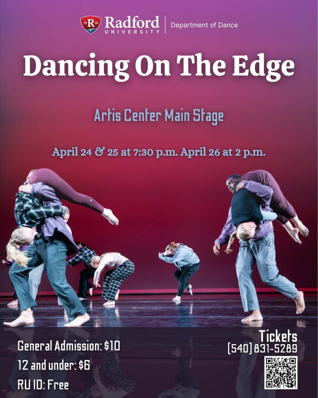 The Radford University Department of Dance presents their annual performance Dancing on the Edge with three performances starting on Thursday, April 24, 2025 through Saturday, April 26, 2025 on the Artis Center Main Stage on the campus of Radford University.