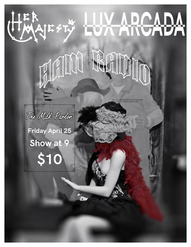 The Milk Parlor presents a Three Band Concert with Her Majesty, Lux Arcada and Ham Radio on Friday, April 25, 2025.