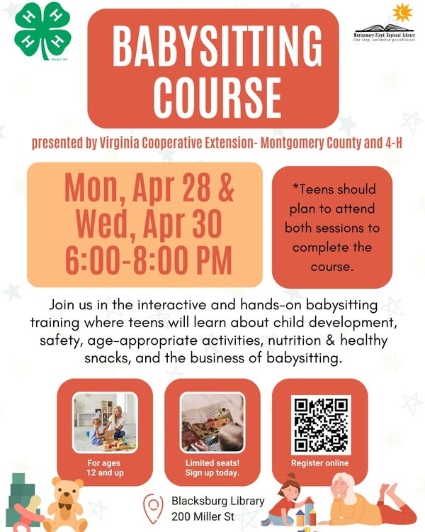 The Blacksburg Library hosts a Two-Day Babysitting Course for Teens with 4H on Monday, April 28, 2025 and Wednesday, April 30, 2025 from 6:00 to 8:00 PM each night.