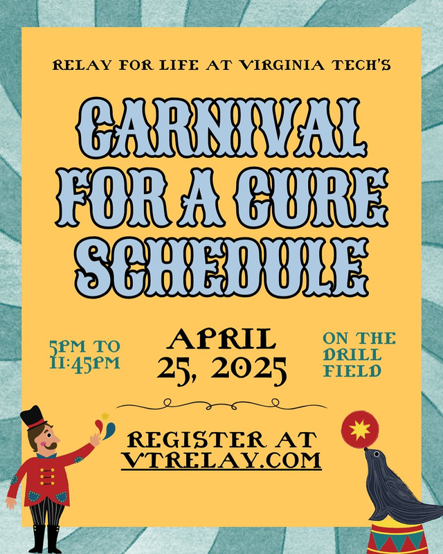Virginia Tech Relay For Life presents their 2025 Annual Event titled Carnival For A Cure on Friday, April 25, 2025 on the Virginia Tech Drillfield.
